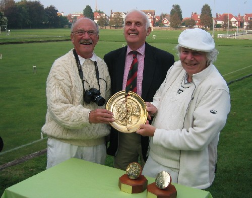 In this case the prizes are of Wol's own uniquely idiosyncratic devising: Chris and Julie received The Wallis Trophies (halves of a red Jaques croquet ball mounted on a wooden plinth); David and George The Wallis Plate (a "brass" plate/dish with an embossed scene of a three-legged race and divided in two, jigsaw fashion).